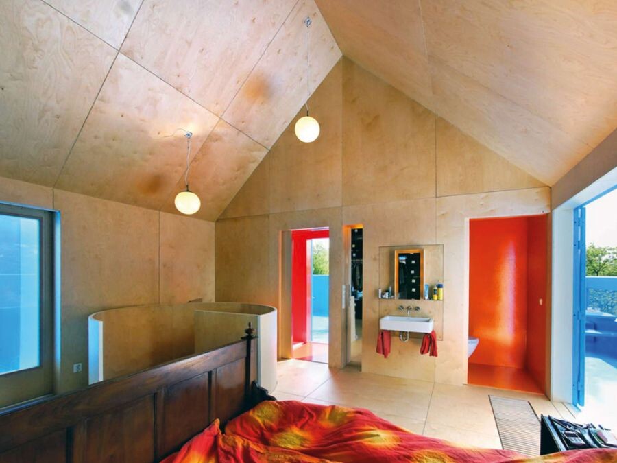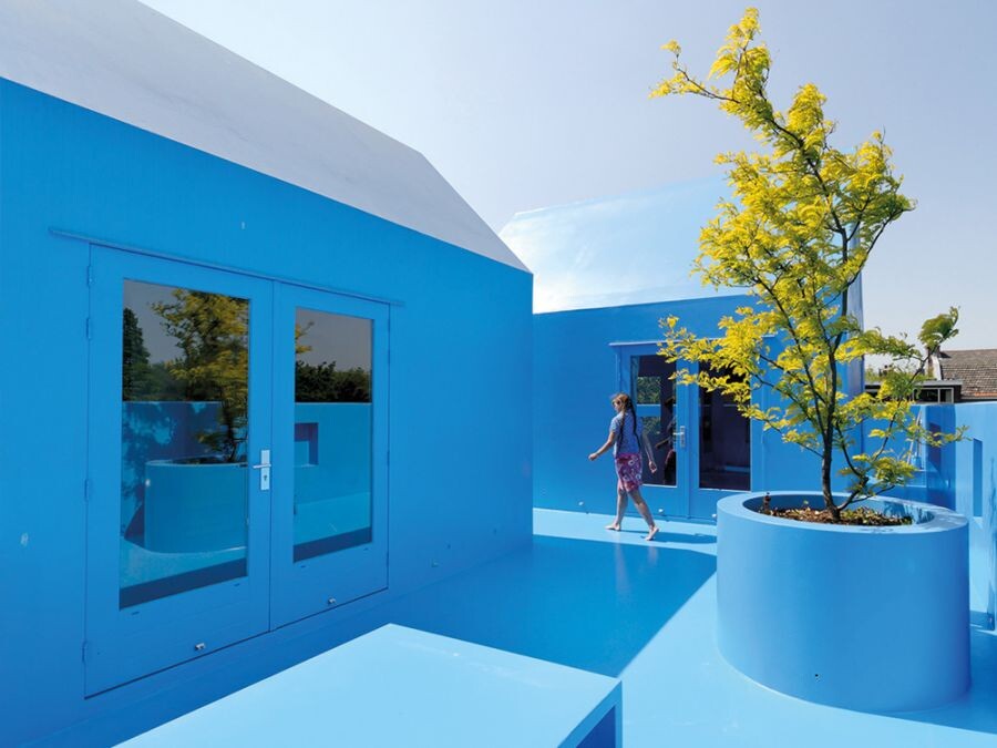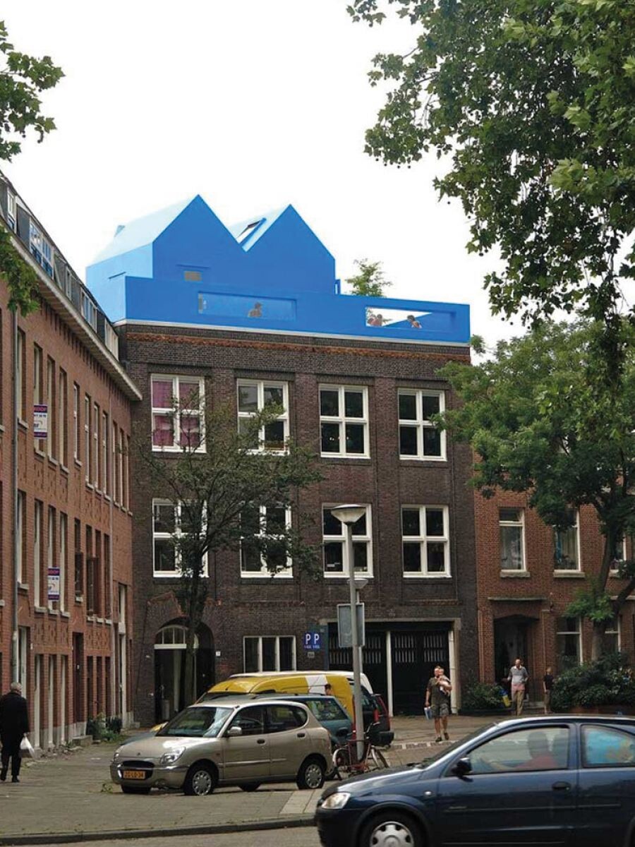 Didden Village (2007), an architectural artwork by Sjoerd Didden, consisting of an addition on the roof of a former clothing workshop in Rotterdam. Three bedrooms were housed in striking separate little houses, a surreal miniature city as an extension of the skyline. The houses received a coating of bright blue polyurea.